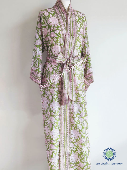 Long Kimono Robe - Paisley Block Print - Lime & Purple